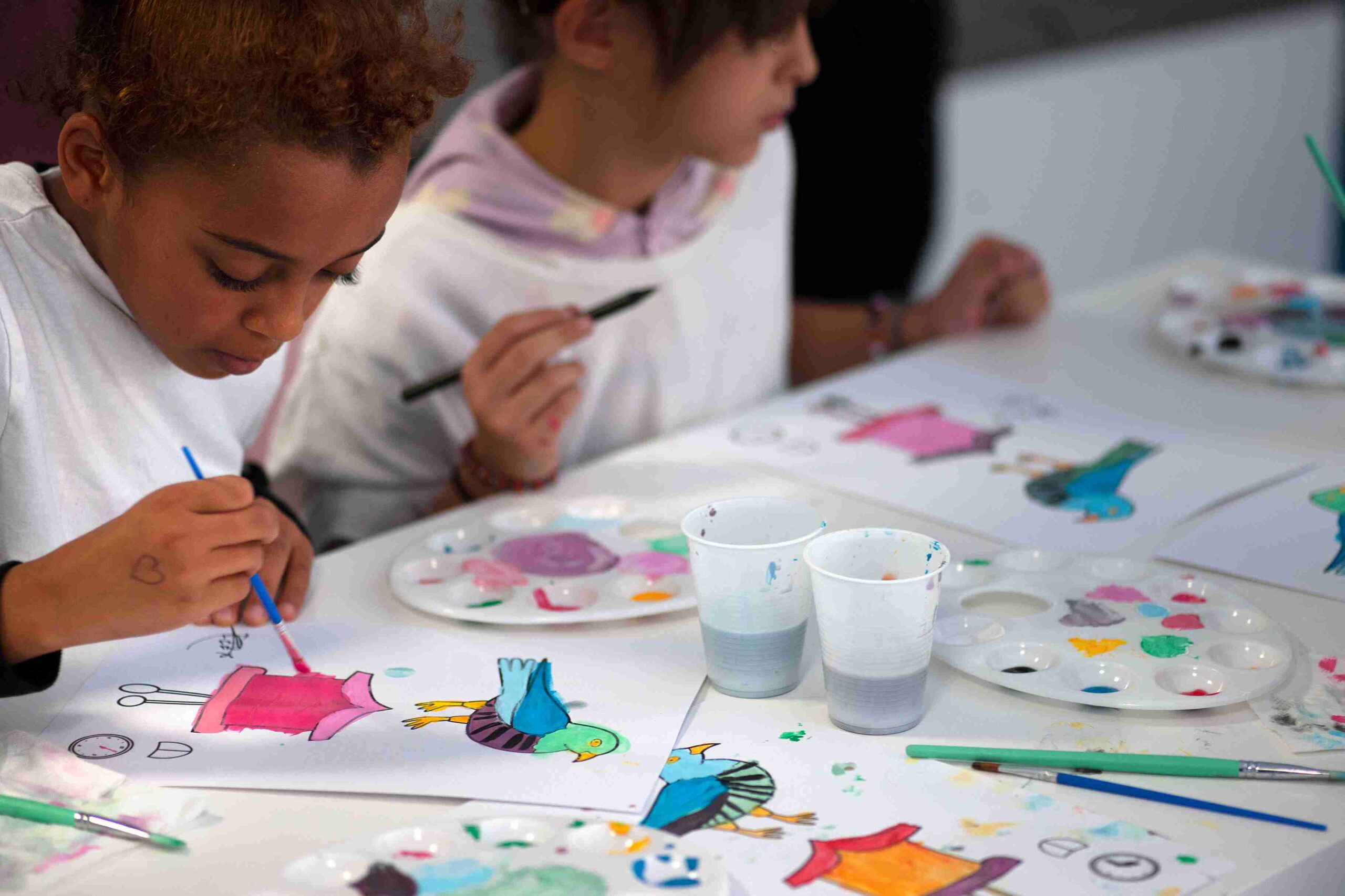 Taller de expresión plástica donde desarrollarán libremente su expresión artística a través de la pintura. En este taller trabajan con collage para crear los tortolitos y sus corazones que posteriormente tomaran la forma de un gran mural para instalar en una fachada del barrio.